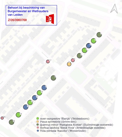 We hebben ons daarom geconcentreerd op de aanplant van nieuwe bomen na afloop van de bouw. Ons voorstel voor compensatie is door de woningbouwvereniging alsook door de gemeente overgenomen (zie kaart hieronder met nummer Z/26/3960768). In de verleende omgevingsvergunning is dat voorstel opgenomen. In plaats van de kleinere bomen die nu in de straat staan (Zweedse lijsterbes), worden bomen aangeplant die van nature groter worden en die daarmee op den duur meer groen gaan opleveren in deze straat. Onder andere zuilvormige eiken en winterlinden (zie de kaart hieronder).
